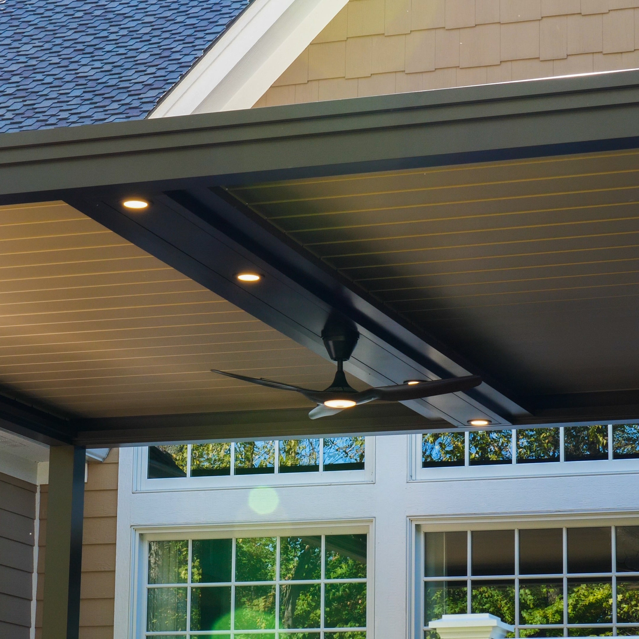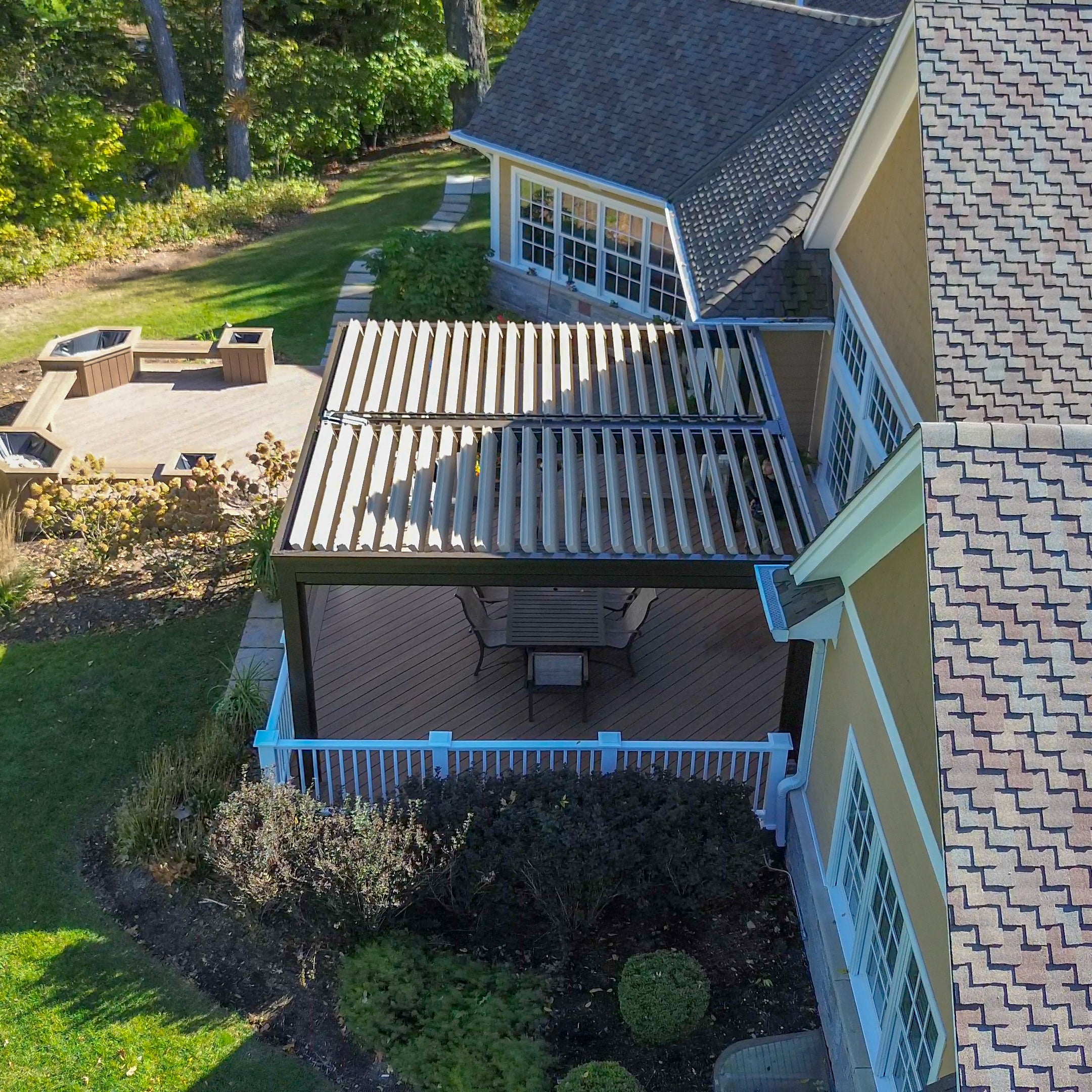 We designed a stunning bronze TitanCover louvered pergola in Chicago, featuring integrated pot lights and a ceiling fan for added comfort. This modern structure perfectly blends aesthetics with functionality, enhancing outdoor living while maintaining an inviting atmosphere. The inclusion of a Phantom screen offers privacy and protection from the elements, making it a versatile space for relaxation.