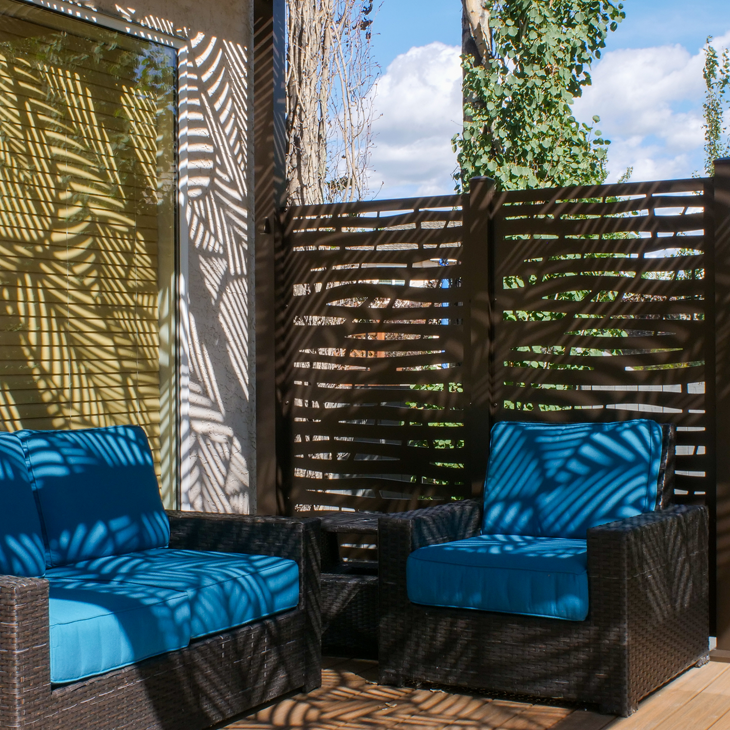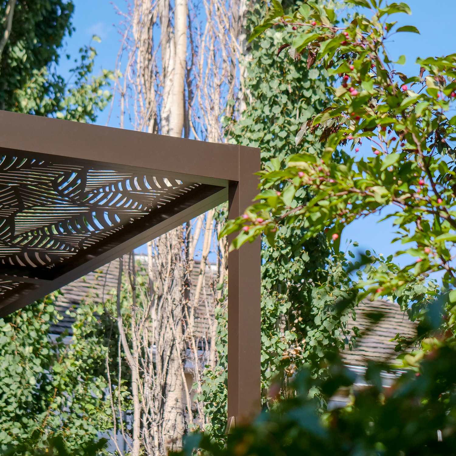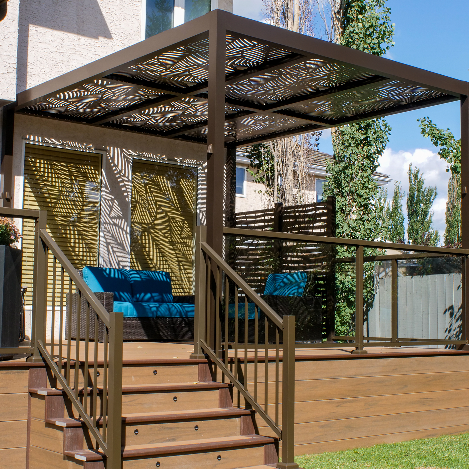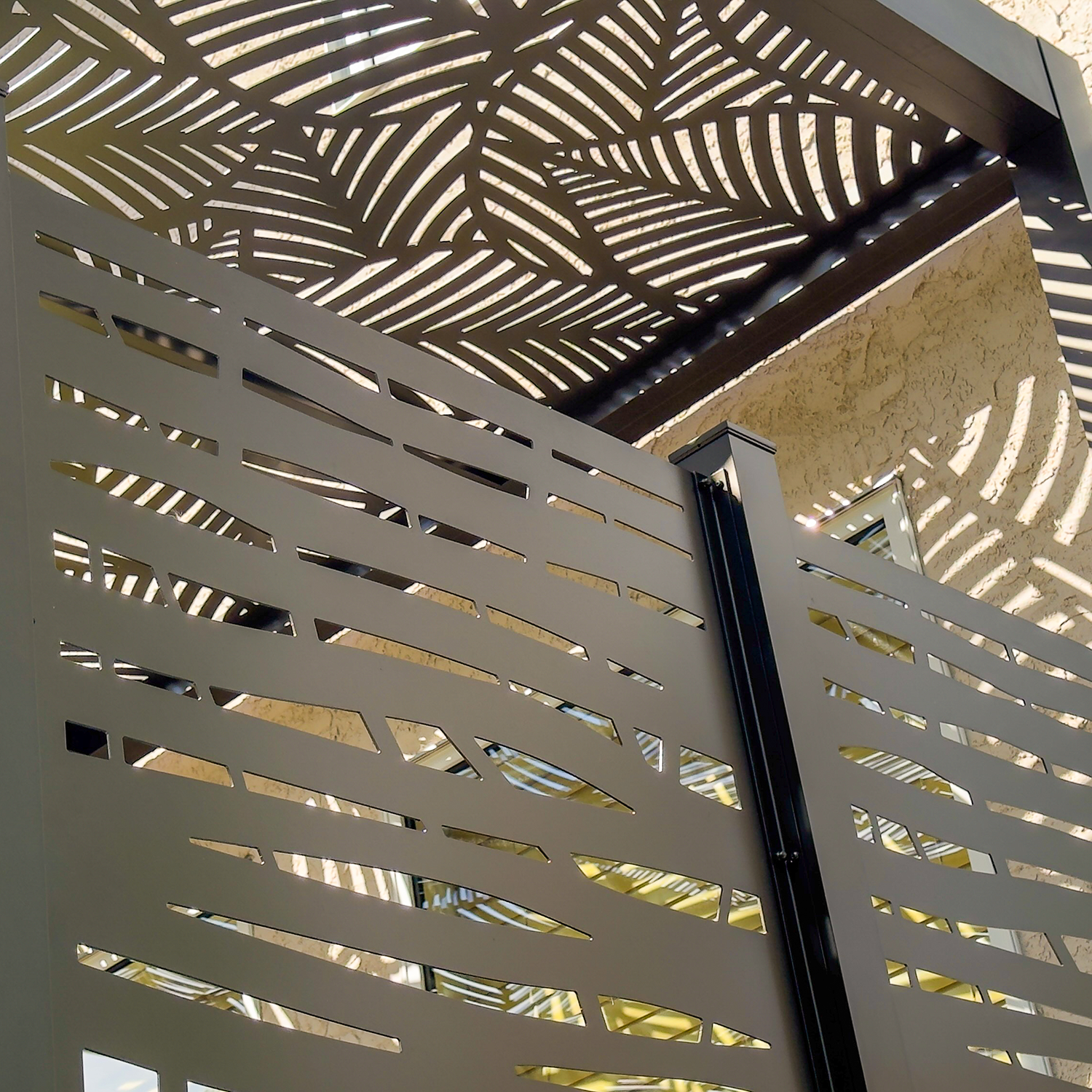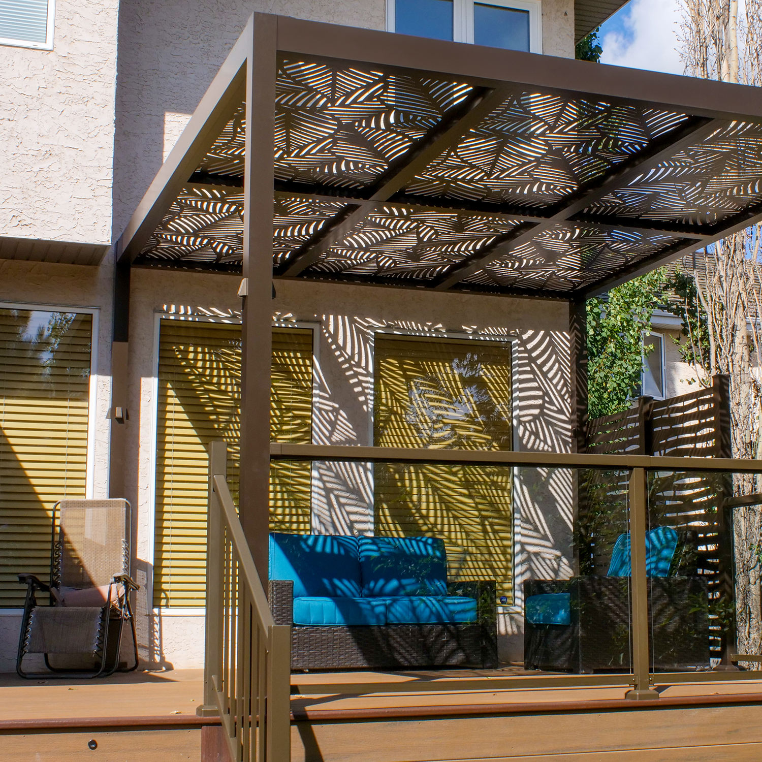 Our latest pergola installation features a stunning bronze finish, perfectly extending the indoor living space into the outdoors. The top is elegantly adorned with Maui screens, providing a seamless blend of style and shade. Two beautifully crafted branch screens on the side of the deck offer added privacy, creating a secluded retreat right at home.